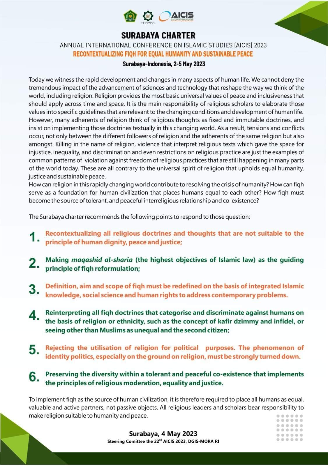 Rumusan Surabaya Charter dibacakan Rektor UIN Sunan Ampel Surabaya Ahmad Muzakki pada penutupan AICIS 2023 di Auditorium UIN Sunan Ampel Surabaya. Turut mendampingi saat pembacaan rekomendasi Surabaya Charter, Prof Dr Mohd Roslan Bin Mohd Nor dari Malaysia, Prof Eka Sri Mulyani (Guru Besar UIN Ar-Raniry Banda Aceh) dan pembicara kunci asing lainnya.
