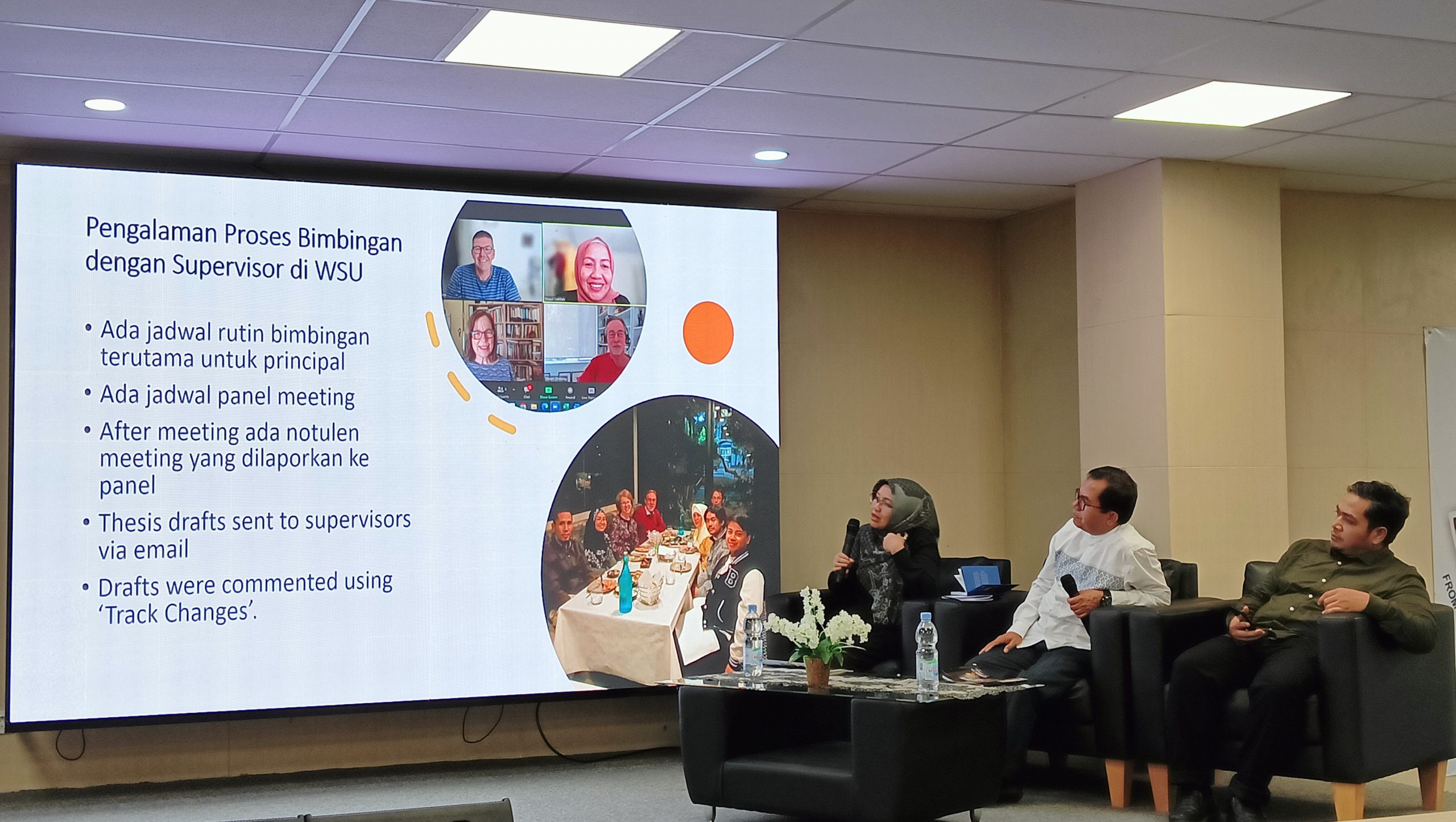 Materi Kemudian dilanjutkan dengan sharing pengalaman Nisaul Fadillah Ph.D saat ia berkulaih di Western Sydney University. Di antaranya bagaiamana cara memperoleh Letter Of Acceptance (LOA), bagaimana memperoleh beasiswa dari Kemenag, bagaimana mensiatati agar selesai kuliah tepat waktu, dan bagaimana trik menyelesaikan penelitian Disertasi di Australia.